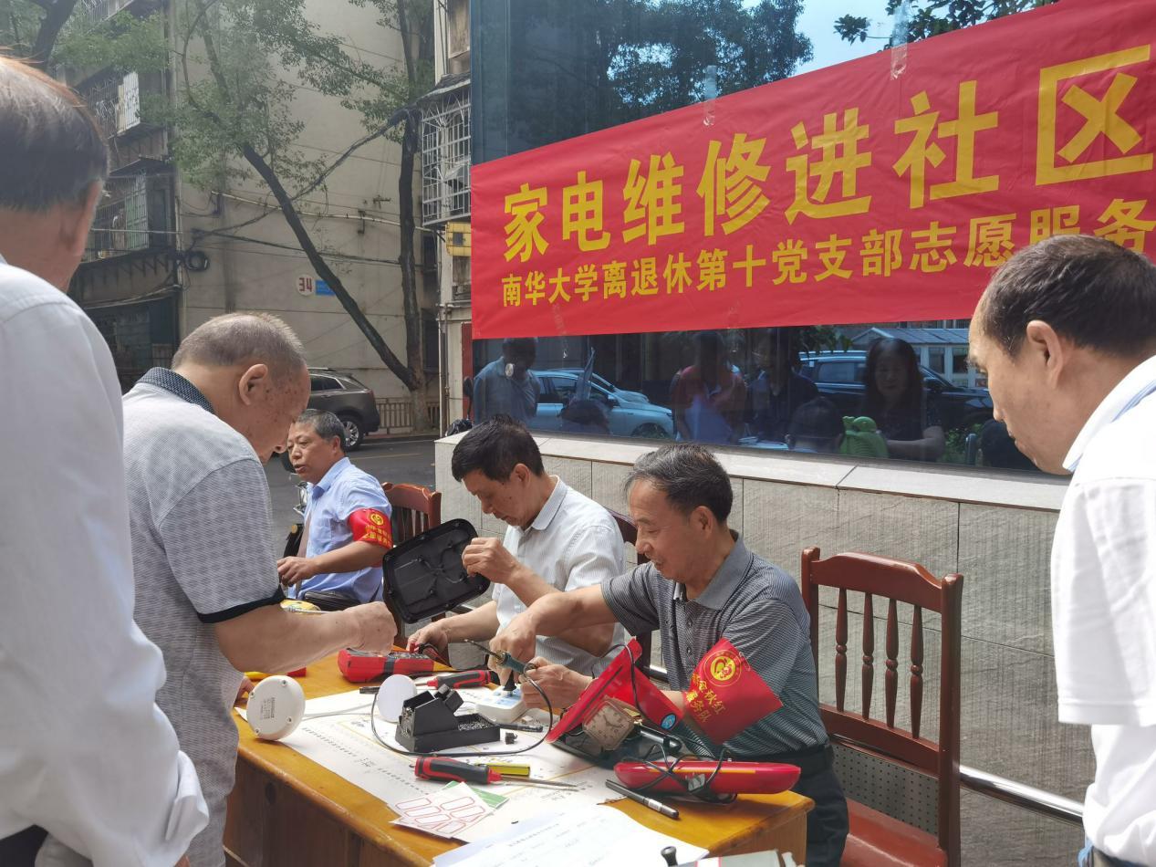 为发挥老党员的专业特长,为社区居民力所能及地解决一些实际困难,5月29日,南华大学离退休第十党支部组织仪修室、实验室退休的张宜贵、周华信和王成春等几名老党员在北校家属区4栋前坪开展“家电维修进社区”志愿服务活动。