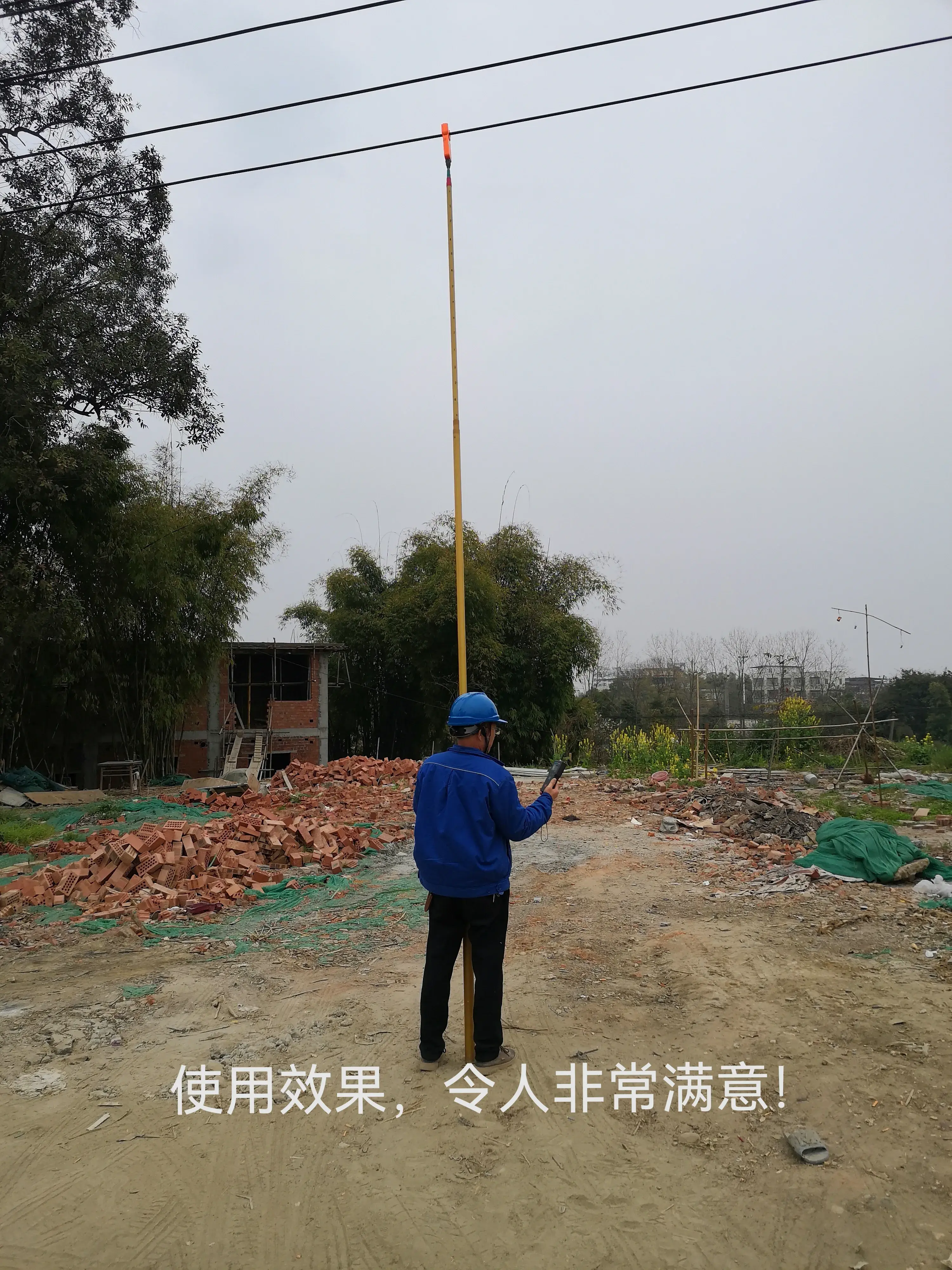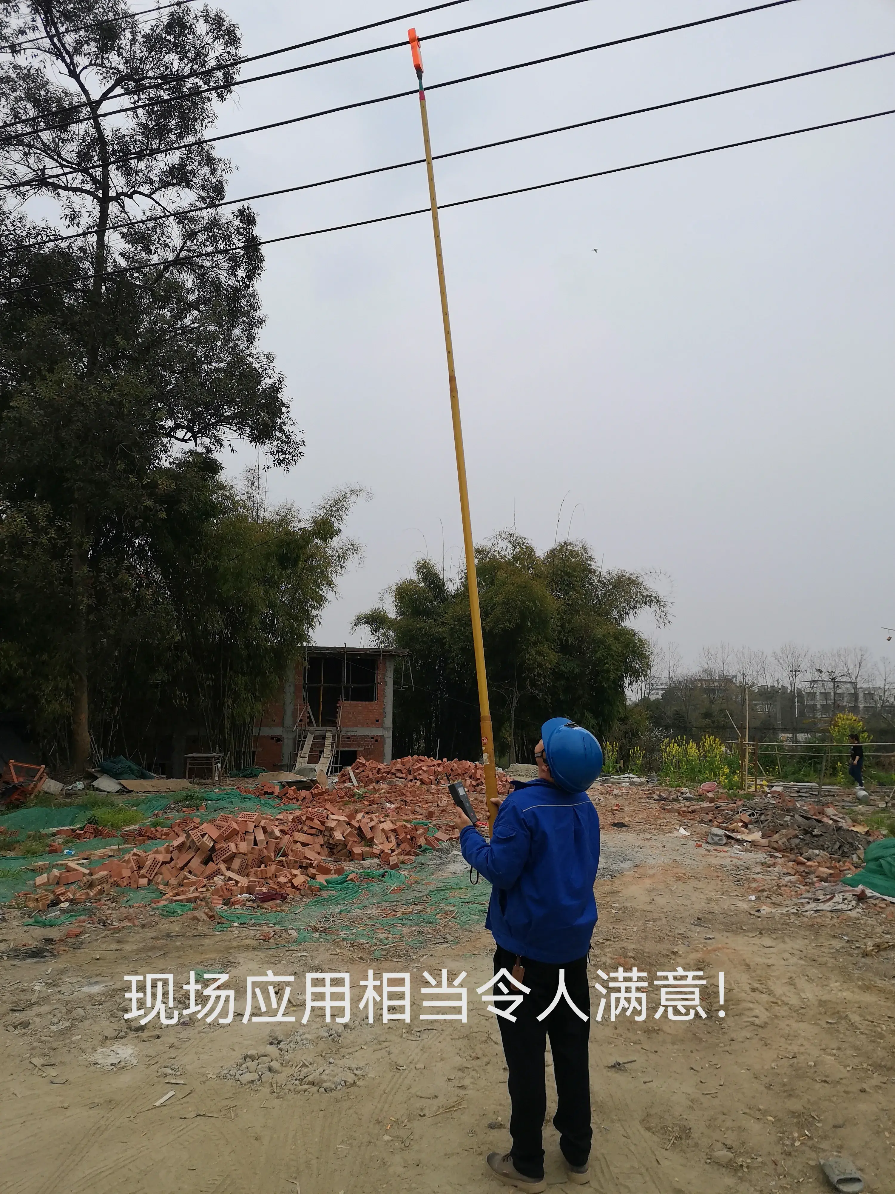 在测量8米及以下架空线路电流还凑合,但是遇到10米以上电杆就不那么方便了,必须用梯子或脚扣加高几米才能测量,况且5米长度要像钓鱼一样把杆子举起来还是比较吃力,某一天看到单位有一根15米长度的伸缩式测距杆,