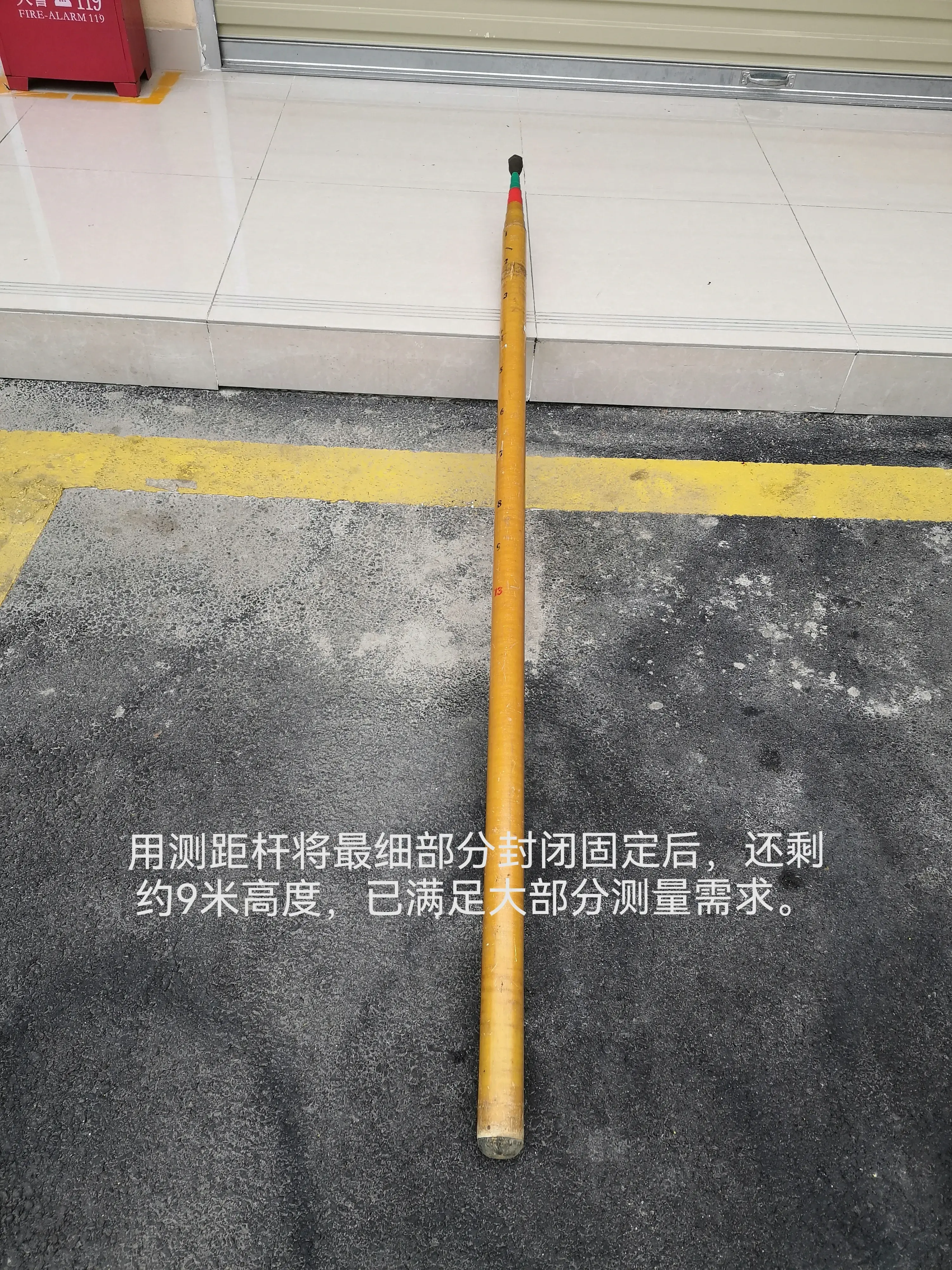 测距杆最前端1-3节由于直径很细,抽出来的话由于钳形表也有二三百克重量,伸出太长杆子弯曲严重,根本举不起来,所以1-3节总计4米长度平时不用抽出来,用胶带把1-3节全部缠绕和第4节封为一个整体,这样完全抽出后剩余长度也有9米左右,已基本能满足我们绝大多数测量环境。