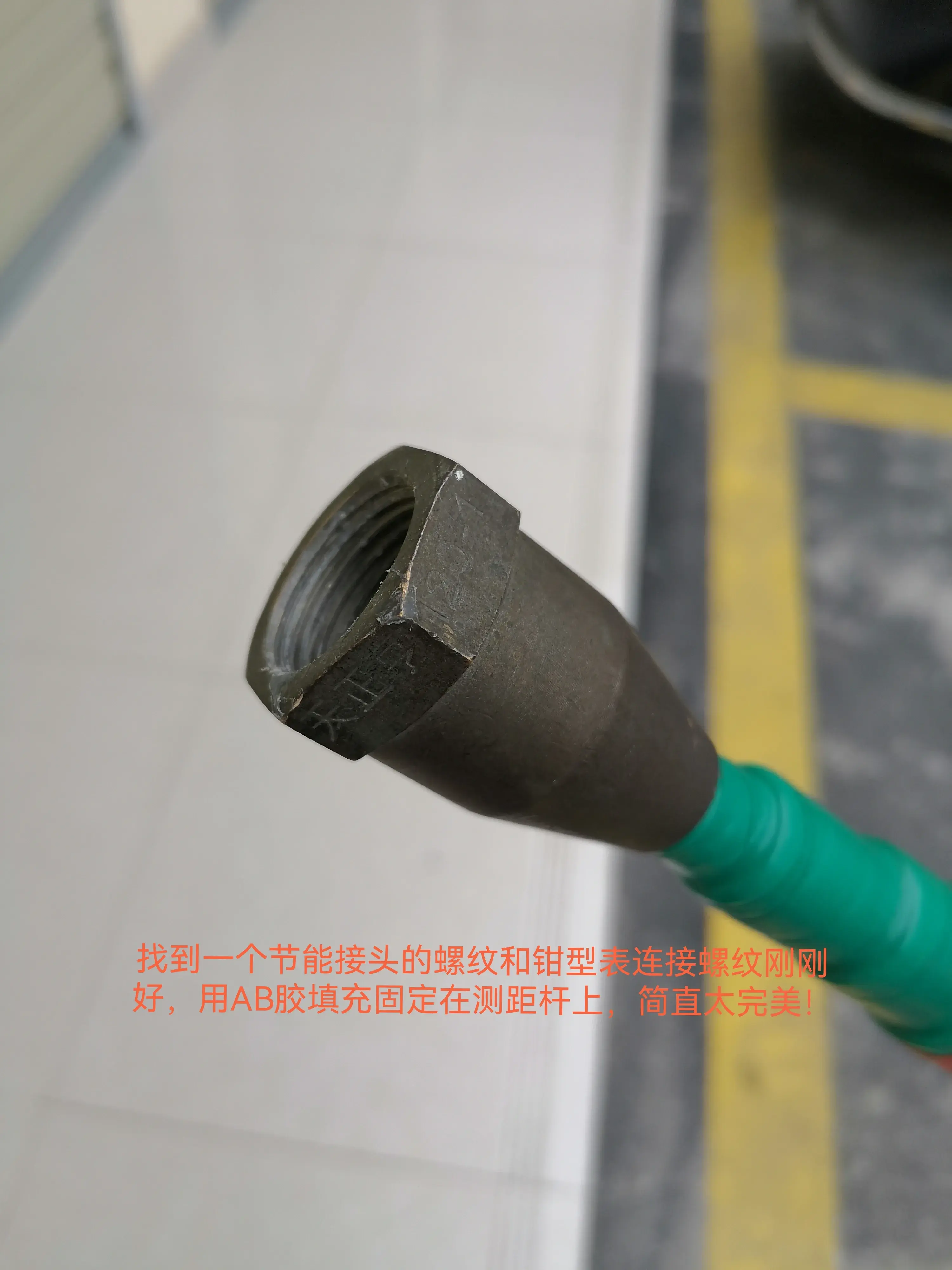 和钳形表连接螺纹刚好匹配,简直太完美了!把接头套在测距杆最前端,然后用AB胶填充封固,过一个把小时已经非常牢固,把钳形表和测距杆连接起来,效果真是杠杠的!