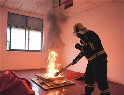 随着对讲机里传来指挥员“点火”的命令,4名全副武装的消防员立即用手中的火把,同时点燃4个房间内的可燃物,并开始计时。