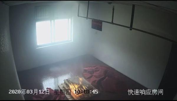 四个房间内都加装了摄像头以便实时观察火势的蔓延过程,房间内堆放了木板,木板周围设置了一圈红色化纤地毯,每个房间的可燃物数量一致。
