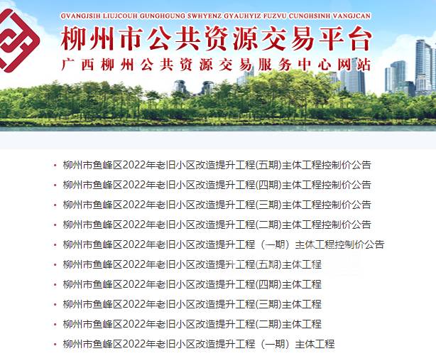 近日,柳州市公共资源交易中心发布公告,对92个老旧小区进行公开招投标,包括城中区、柳北区、柳南区、鱼峰区的92个小区,涉及1.2万多户。
