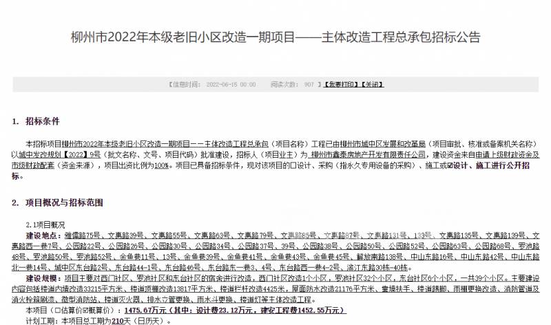 柳南区2022年冲压件厂宿舍等9个老旧小区主体和基础设施改造工程,涉及2148户。