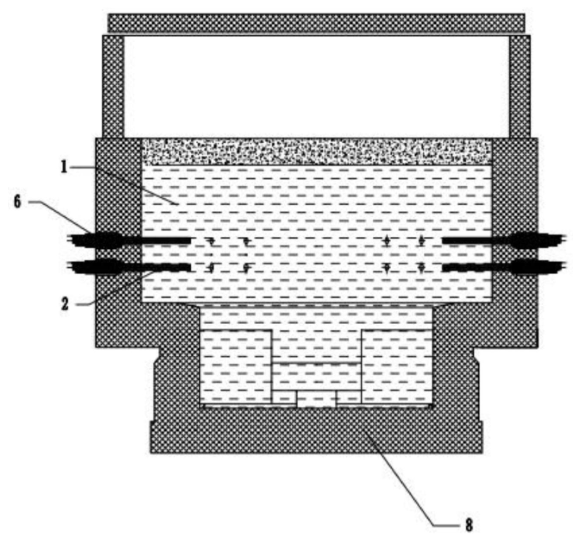 1、熔化池;101、熔化池上池;102、过渡层;103、熔化池下池;2、主熔电极;3、均化电极;4、流液洞;5、上升通道;6、电极水冷套;7、炉顶;8、炉底。