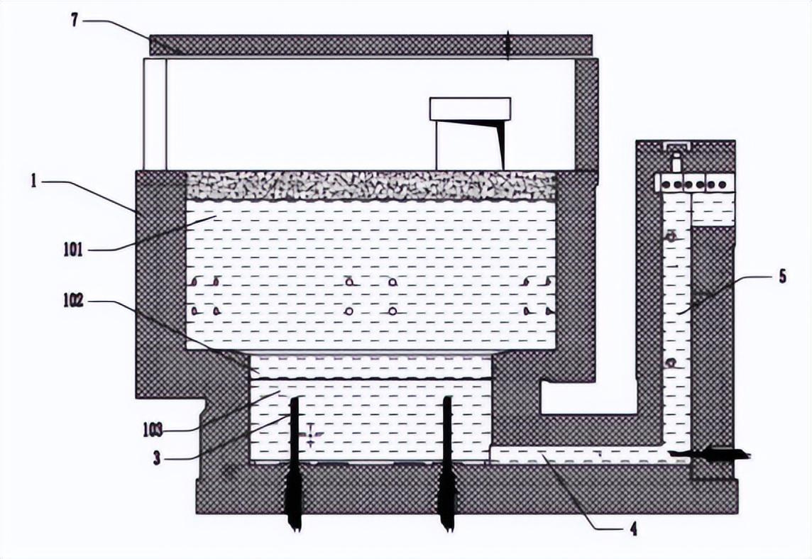 熔融的玻璃液在重力作用下沉降,经过过滤层102,过渡层102将玻璃的熔化过程与均化、冷却过程分开。熔化的玻璃液继续下降到下池103,在下池103 内的均化电极3的作用下保持温度,等待成型。