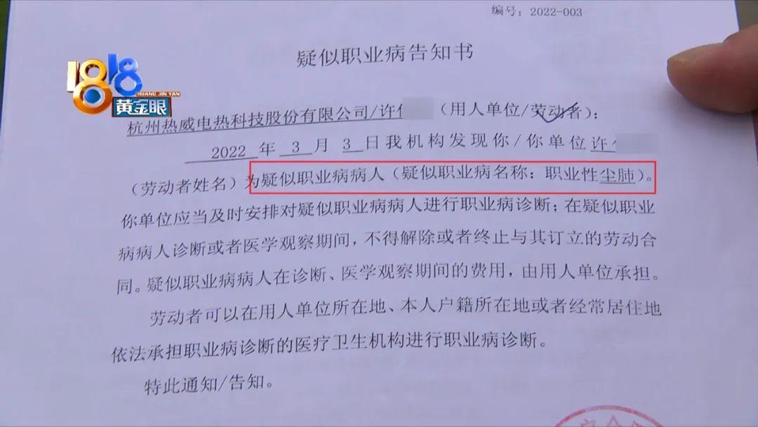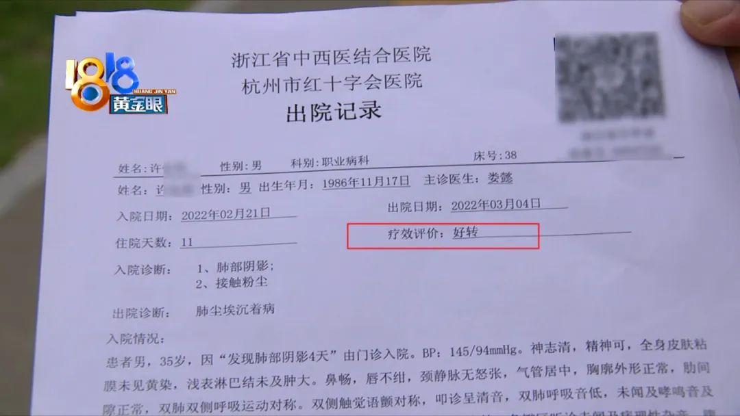 此前,杭州红十字会医院诊断是:许师傅患了“肺尘埃沉着病” 。还发出了疑似职业病告知书,大概内容是许师傅是疑似职业病病人,疑似职业病名称是:职业性尘肺 。告知书提醒许师傅,可以在承担职业病诊断的医院进行职业病诊断。