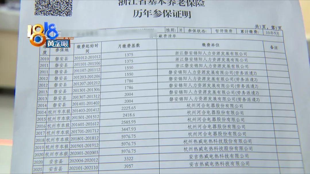 许师傅打印出了自己的养老保险历年参保证明,还挺复杂,2010年到2014年,他的缴费单位是磐安绵阳人力资源发展有限公司,后面有括号注明是劳务派遣;2014年到2018年,缴费单位是杭州河合电器股份有限公司,许师傅说河合电器也是热威机电的公司,地址也在滨康路800号;2019年到2020年,缴费单位是杭州热威;2020年4月到2021年10月,缴费单位是安吉热威。