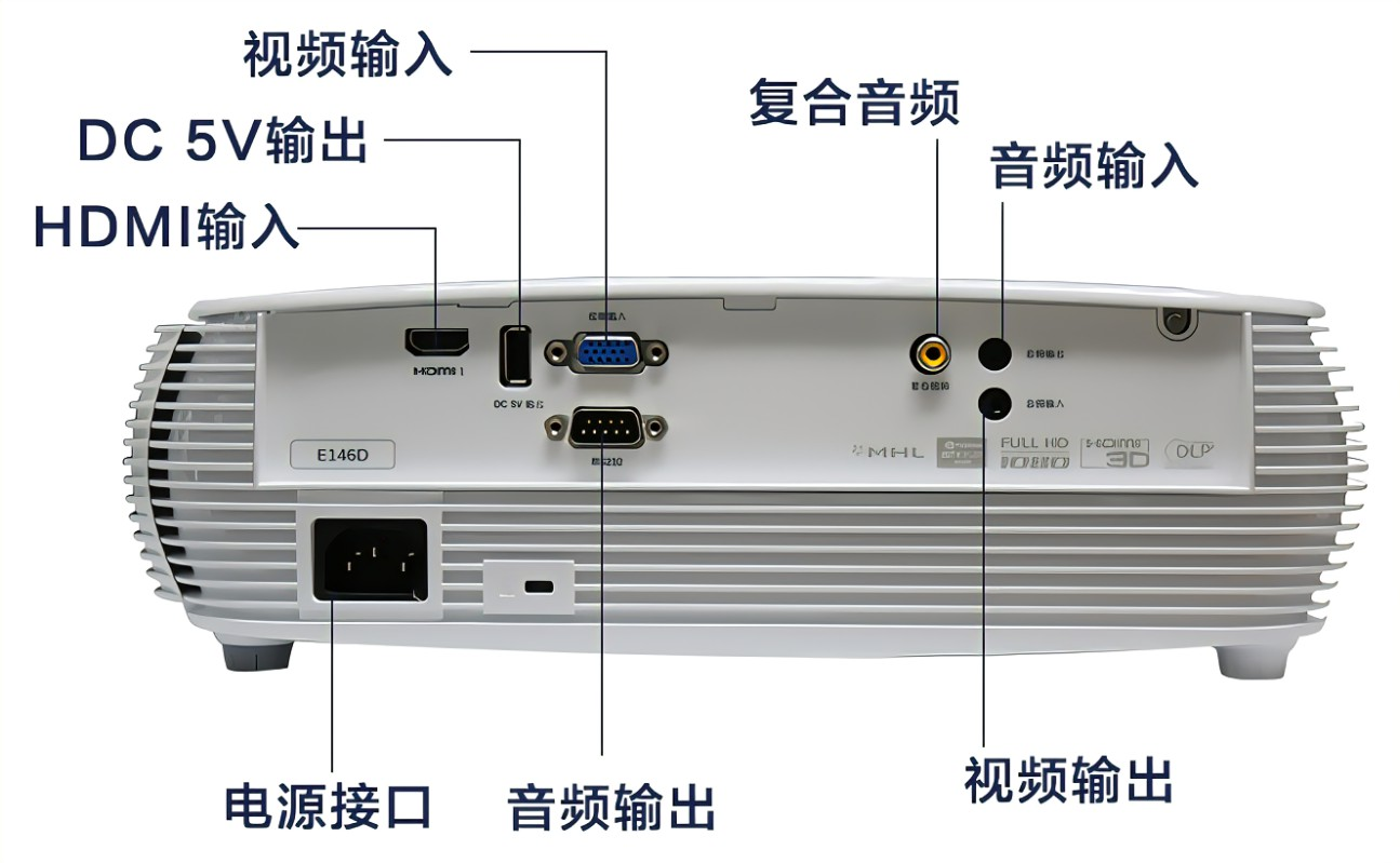 比如硬盘播放器、DVD等信号源需要用HDMI线连到投影仪的HDMI输入接口上,还需要使用音频线一头连接功放设备,另一头连接投影仪的音频接口。