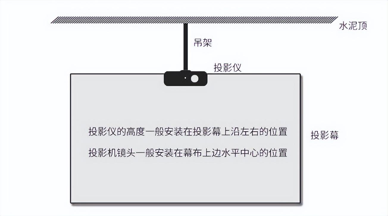 在家庭影院中,幕布的高度一般是离地面60-80厘米左右,而投影仪的位置以挂顶居多。镜头高度建议在幕布上部分竖直中线附近,以镜头对正为准,不是以整个投影仪为准,因此一定要先确认幕布的位置再去测量投影仪的高度。