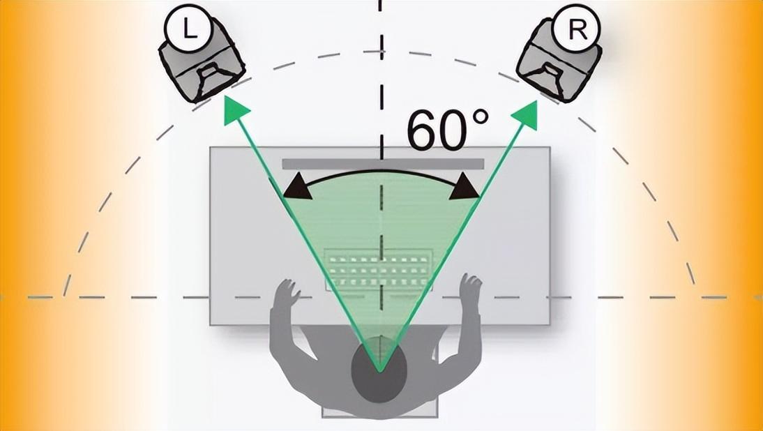 人与音箱之间的距离有一个“正三角形摆放方法”,即将左右音箱旋转,尽量使音箱喇叭面向耳朵,让高音单元和耳朵保持水平位置。人与左右音箱距离一致,形成一个等边三角形。