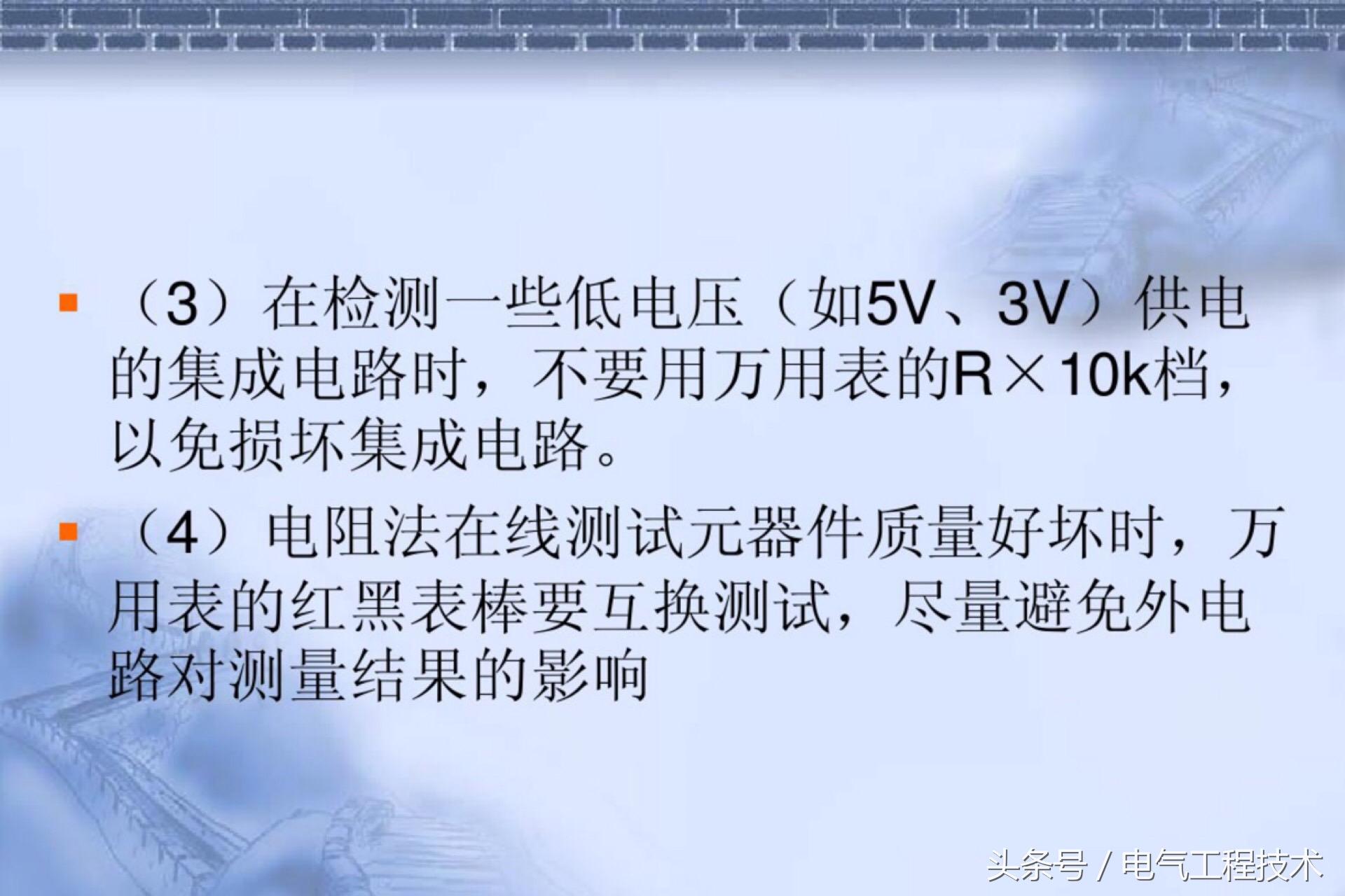 (3)在检测一些低电压(如5V、3V)供电的集成电路时,不要用万用表的R×10k档,以免损坏集成电路。