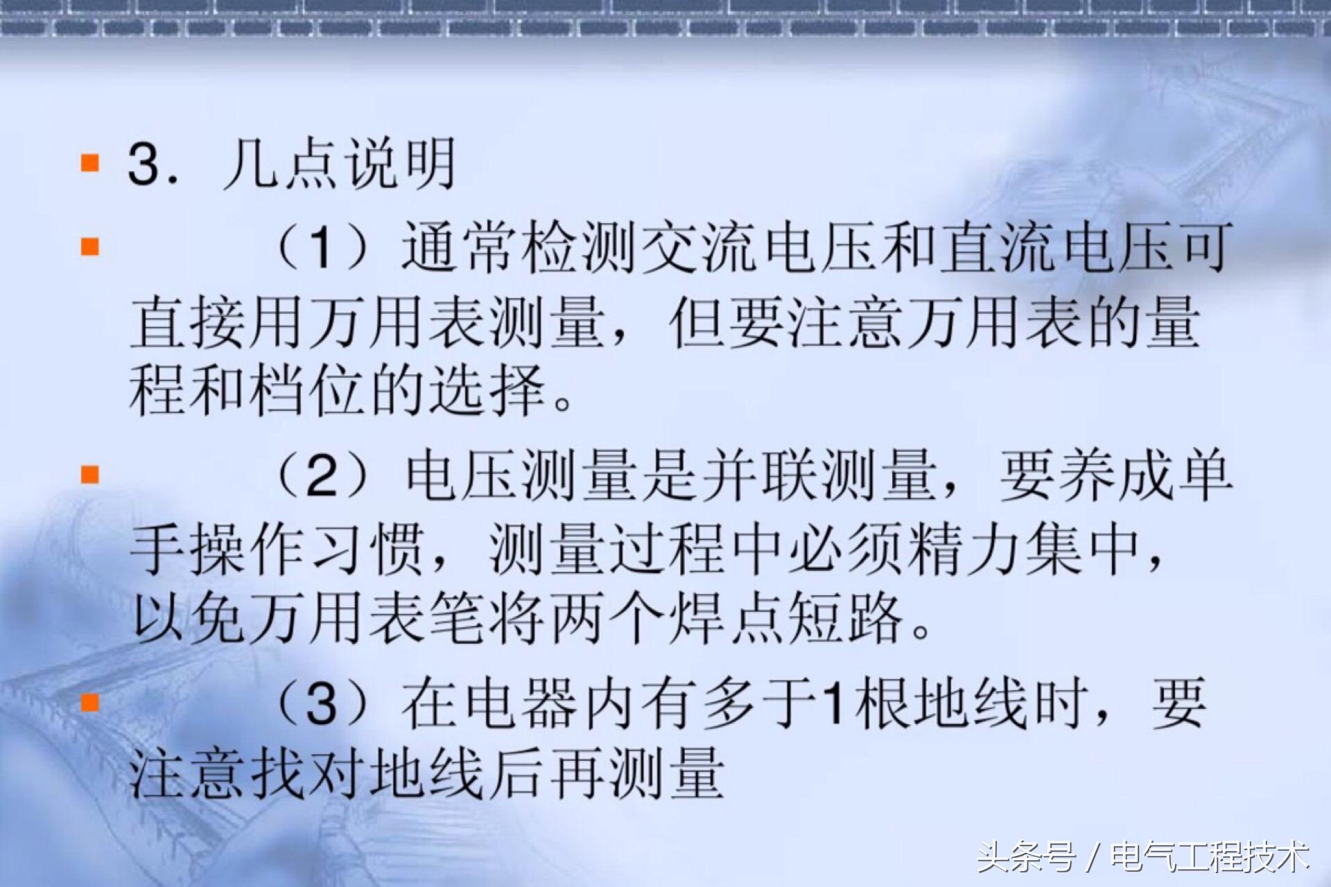 (2)电压测量是并联测量,要养成单手操作习惯,测量过程中必须精力集中,以免万用表笔将两个焊点短路。