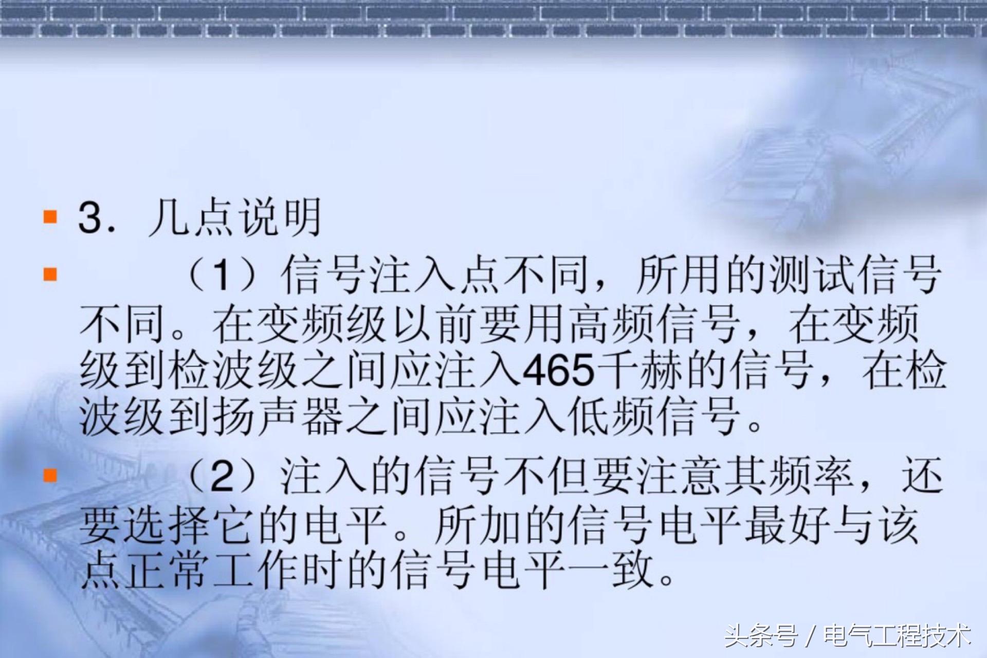 (1)信号注入点不同,所用的测试信号不同。在变频级以前要用高频信号,在变频级到检波级之间应注入465千赫的信号,在检波级到扬声器之间应注入低频信号。