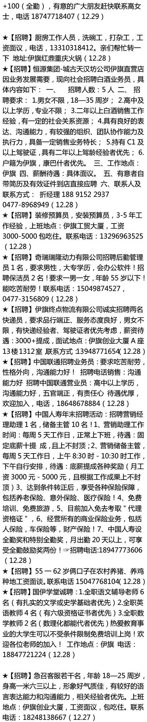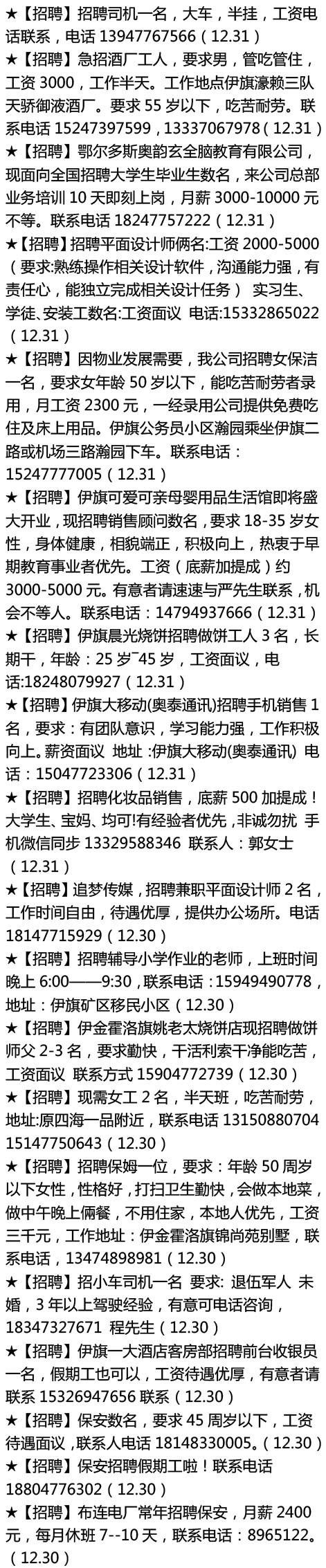 ★【招聘】司机2名,快递员2名,要求会使用智能手机,肯吃苦,熟悉康巴什新区地理位置,男性优先,45岁以下,薪资:司机3000元-5000元,快递员3000元+提成。电话13948771654(1.3)