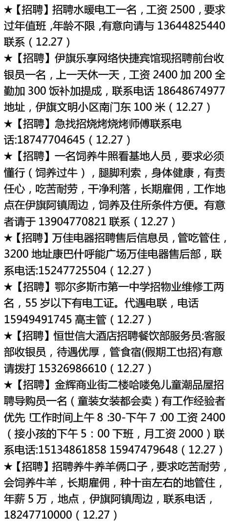 ★【招聘】福正家电诚招以下人员:康巴什店销售员四名:35周岁以下,高中及以上学历,一年以上家电、建材销售经验优先录用,能力强者可放宽政策,工资2500加300全勤加提成(3000-8000元); 伊旗店收银员一名: 28周岁以下,本地户口,沟通表达强,有一定财务知识,一年以上工作经验,工资2200加300全勤。物流搬运3名,熟悉本地路线,2年以上驾龄,工资4000-8000元 ,电话:18947761330;13947704411.(1.2)