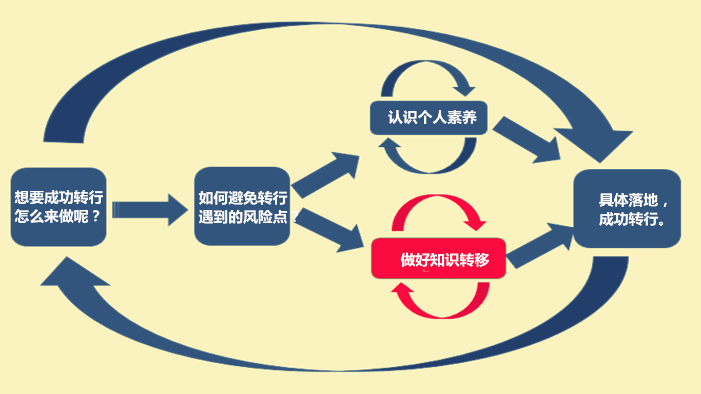 关于如何成功换行,我从身边的例子出发,引出职场换行的风险点,教你如何理解个人的职场素养,并且正确的解析了关于换行中个人知识迁移的方方面面,那么最后就是落地时候如何去做了,这就是“案例--风险点--关键点---如何做”的分享逻辑。