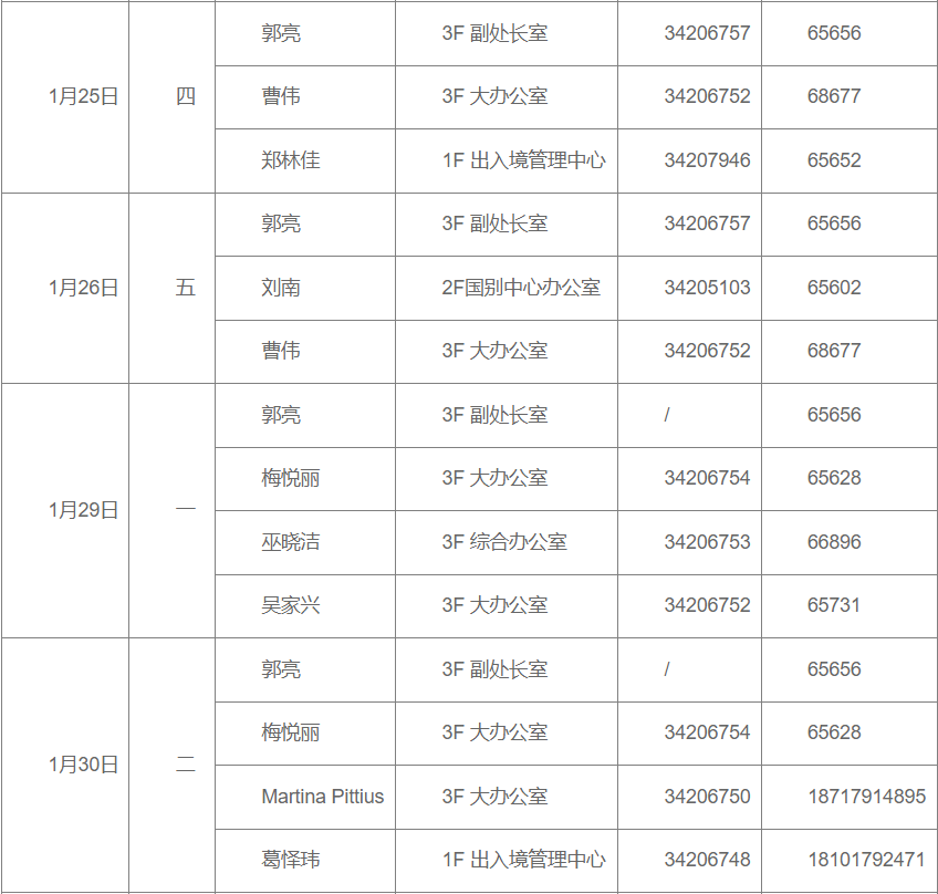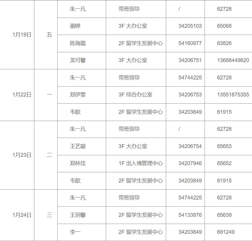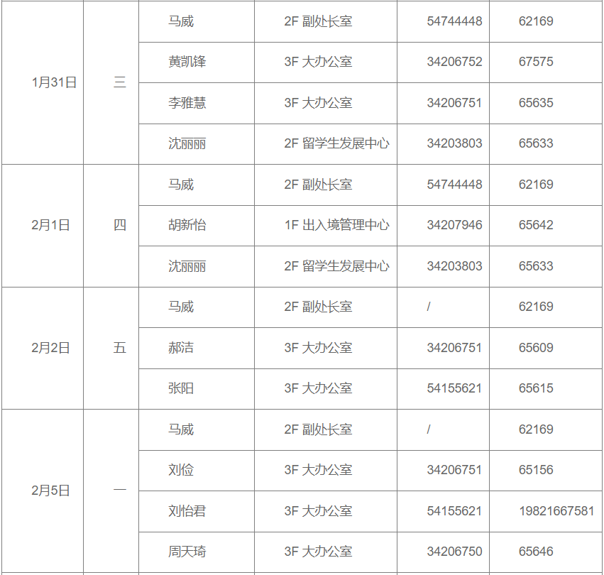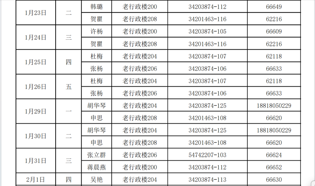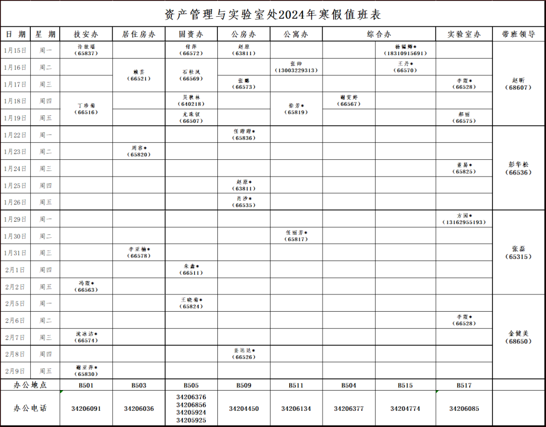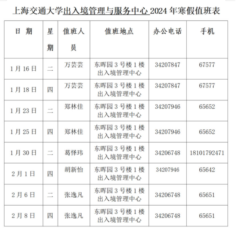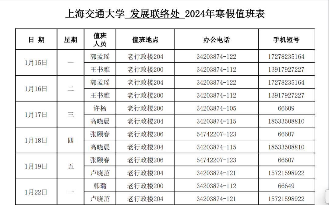 小编为大家整理了2024年寒假期间 餐饮、商业、浴室服务、校门开放安排、治安服务工作安排、交通窗口工作安排、户政窗口工作安排、图书馆开放安排、交通保障、医疗保障、校园卡一卡通充值、交通卡充值、水电缴费、收发室服务、固定电话业务受理、水电零急修、零急修服务、体育场地开放安排、学生服务中心工作安排、教务处工作安排、研究生院工作安排、网络信息中心工作安排、文博场馆开放安排、档案服务利用大厅(闵行校区)工作安排、财务计划处工作安排、资实处(安环中心)工作安排、国际合作与交流处工作安排、期刊中心工作安排、发展联络处工作安排、出入境管理与服务中心工作安排、科学技术发展研究院工作安排、学生创新中心寒假开放安排、心理咨询中心工作安排等相关工作安排通知。