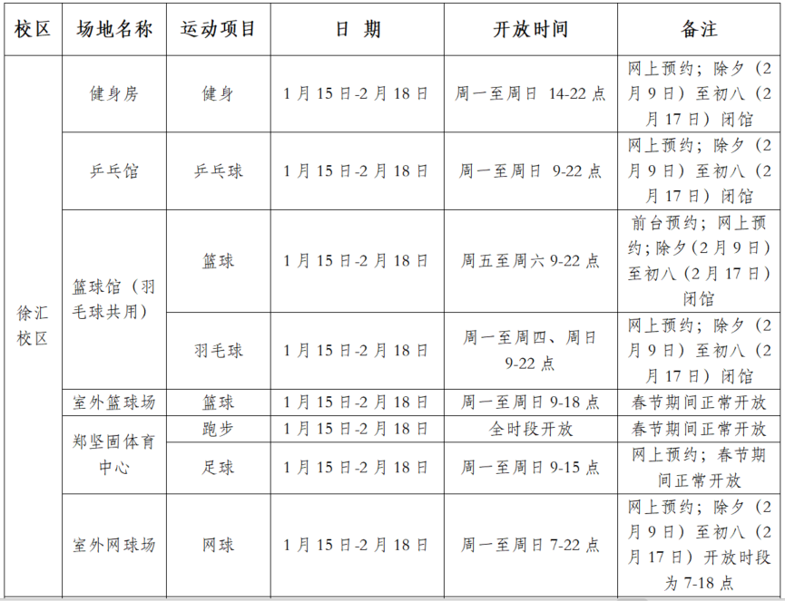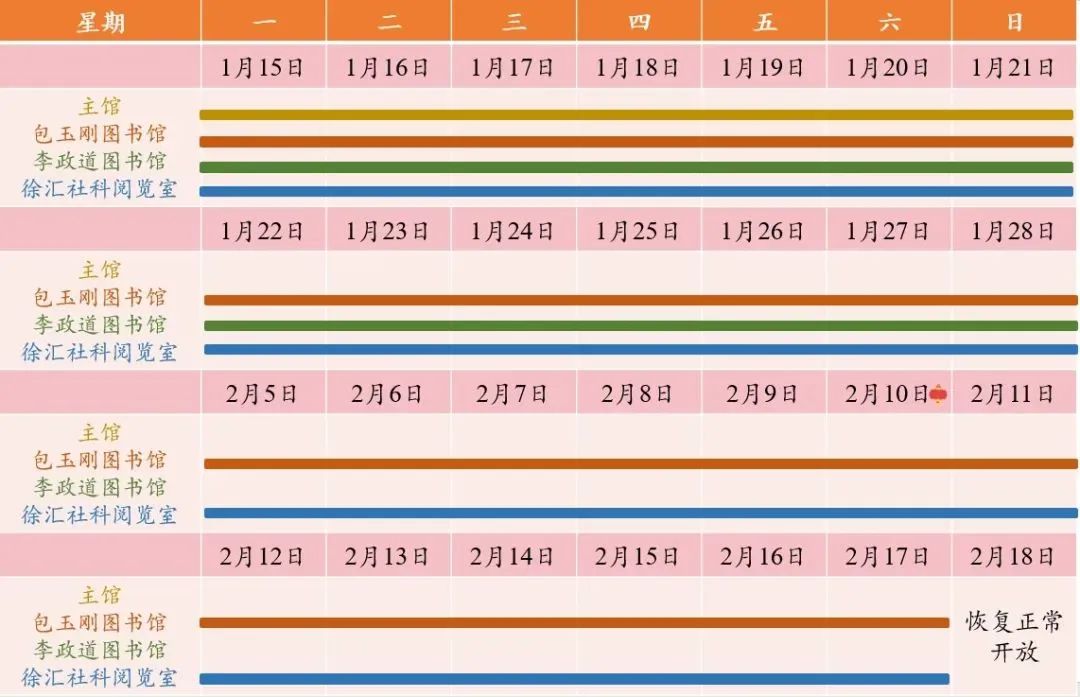 学生餐厅: 1月18日-1月25日暂停服务;1月26日-2月4日正常营业;2月5日-2月15日暂停服务