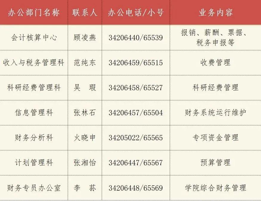业务咨询电话 54741234 转拨“1”,也可通过 54741234 热线平台在线客服进行财务咨询,联系邮箱jdcwyms@sjtu.edu.cn,紧急事项可与相关业务部门联系,联系方式如下: