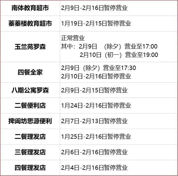 自选餐厅、超霖美食: 1月29日-2月16日暂停服务