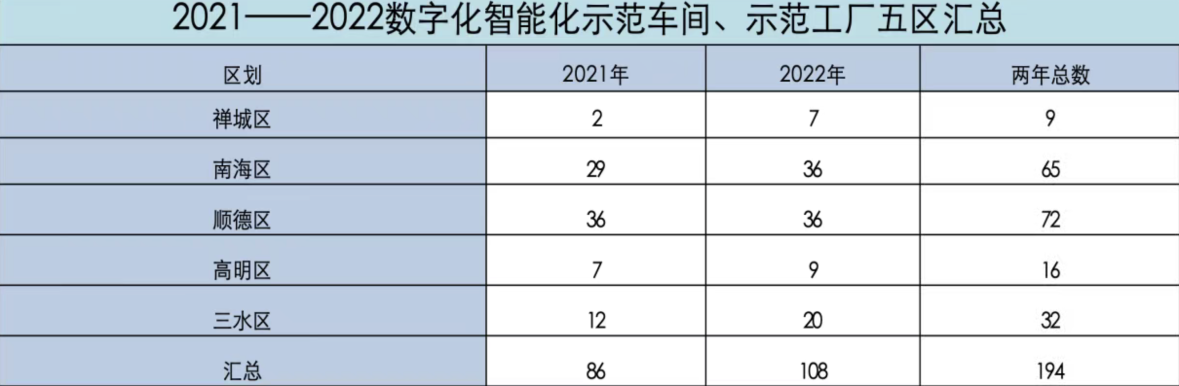 近两年,佛山市评审出数字化智能化示范工厂、示范车间,共194个。其中,2022年的数量为108个,比2021年增长了25.58%。