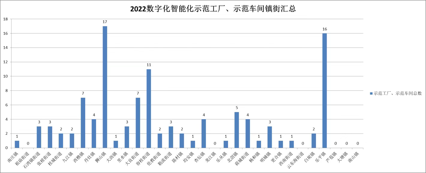 单看2022年的数据,数字化智能化示范工厂、示范车间数量在镇街排名呈现新趋势。除了南海区狮山镇蝉联第一之外,数量增幅最大的是三水区乐平镇,从2021年的9个,增加至16个,增幅为77.78%,位居第二。顺德区大良街道和南海区西樵镇并列第三位。此外,有6个镇街实现了0的突破,杏坛镇从2021年的0个增加至4个。
