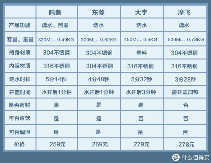 不过内胆材质才最重要,直接关乎我们入口的水质。鸣盏、大宇和摩飞的内胆材质都采用了最优质的316无缝内胆,东菱的内胆材质是304无缝内胆,也还不错。