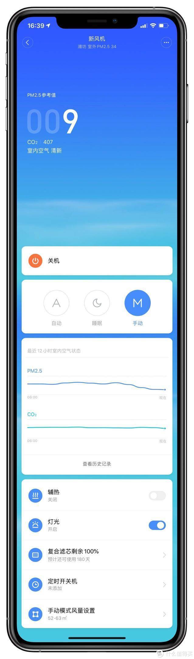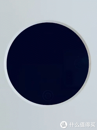 这个圆形窗口就是小米米家新风机A1风量的操控窗口,同时也是显示运行状态的屏幕。一共有三个虚拟按键,分别是:开关/模式切换键、辅热键、灯光键。除了显示机器的运行状态外,最重要的就是显示PM2.5和二氧化碳的数值了。最上方的彩灯是显示空气质量状态的:绿色代表空气清新、黄色代表轻度污染、红色代表重度污染。