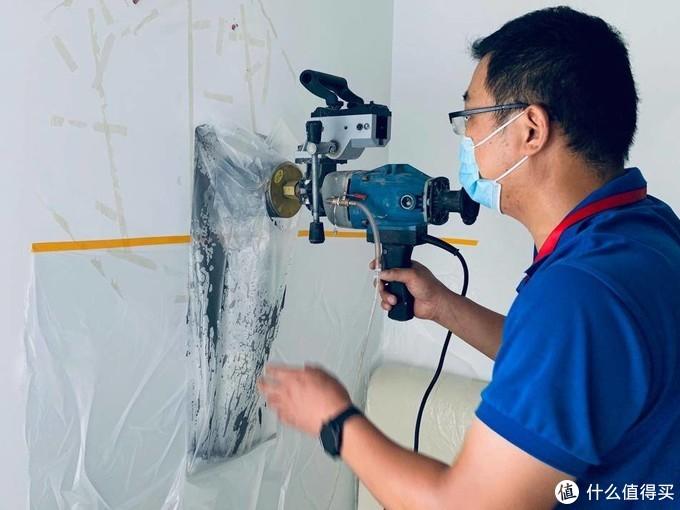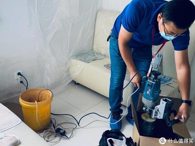 安装师傅正在调试水钻,并提前接好了一桶凉水,水钻会边钻孔边出水冷却钻头,以保证钻头的最大工作效率,这个环节噪音比较大,而且是无法避免的,如果家里有老人小孩,可以先让他们出去一会儿,整个的打孔过程大概耗时10分钟左右。当然,不同的墙体材质和厚度,打孔耗时会不一样。