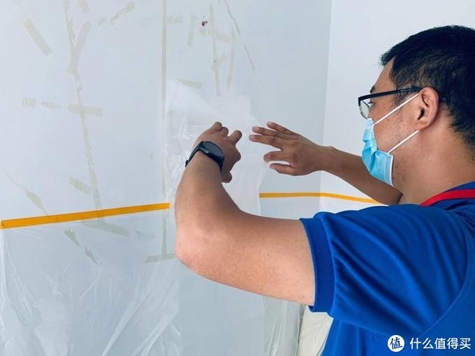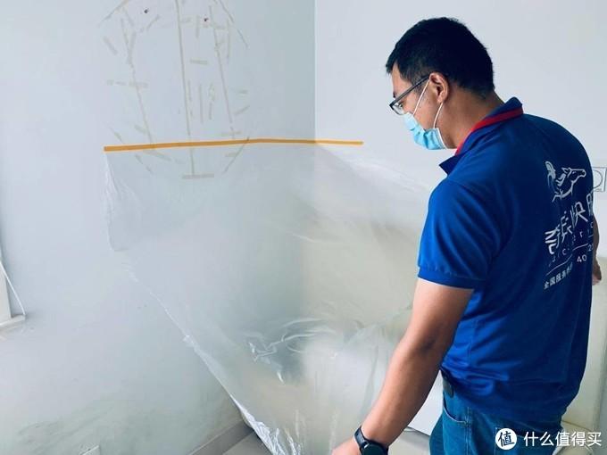 因为要打一个直径较大的风道孔和四个膨胀螺丝的悬挂孔,免不了会尘土飞扬,所以这时就要铺设防尘膜了,虽然安装师傅说整个安装过程本来就是无尘的,但为了用户体验,最终还是必须要铺设防尘膜的,这是标准流程要求的。