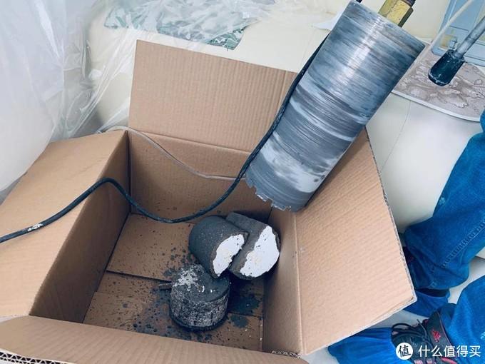 大概过了十分钟左右,打孔的工序就结束了。因为楼主家地处北方,所以墙体通常有泡沫层,打起来相对混凝土的墙体还是要轻松很多的,下面的图就是我拍摄的打出来的墙芯。这个钻头确实给力,而且冲击力很大,看了看牌子是东成的。