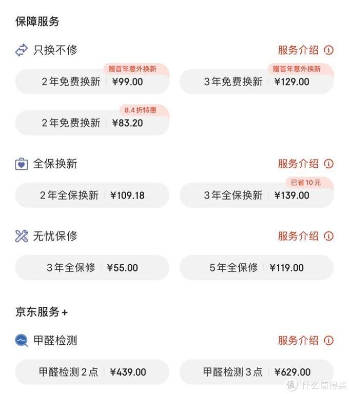 楼主提前做足功课后,便开始了新风机的选购,这类大件家电楼主比较习惯在京东购买,因为京东的售后保障有时候甚至比官方商城还要完善,另外还有官方商城没有的追加保障服务,可以选择2年期或3年期的只换不修、全保换新或无忧保修。
