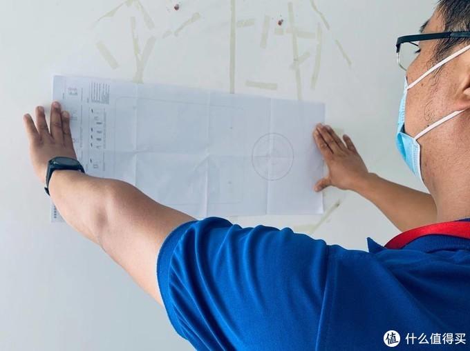这里就是楼主最终确认的安装位置了,这时需要拿出说明书附件中的安装说明,展开后是辅助安装的卡纸,用来确定风道的位置和四个挂钩的相对位置。确认好后再用铅笔打上几号,等等打孔、悬挂的时候会用到。