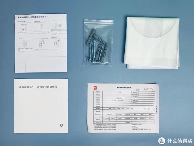 打开包装后,产品清单如下:新风机主机(内含高效复合滤芯和防蚊虫滤网)、风管、风帽、说明书、打孔防尘袋和膨胀螺丝。