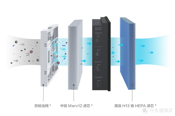 下面是我拆出来的2+1层复合过滤网,复合滤网是由高效H13级HEPA滤芯+中效Merv12滤芯组成,将两者的优势进行了互补。