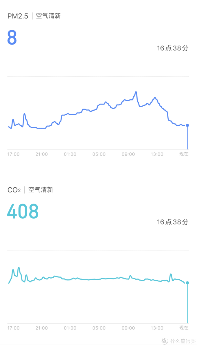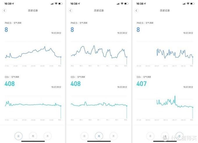 通过曲线可以得知,PM2.5的数值不断降低,从最高的54降至最低的11;而二氧化碳的数值则从最高的567降至最低的401,可能因为楼主家住高层的原因吧,PM2.5的效果比二氧化碳来得更明显。