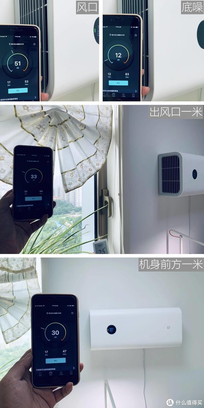 首先关闭机器测得底噪为12dB。然后分别进行3个不同位置的噪音测试:出风口工作噪音为51dB,距离出风口 1 米远的位置噪音为33dB,机身前方距离1米元的位置噪音为30dB。