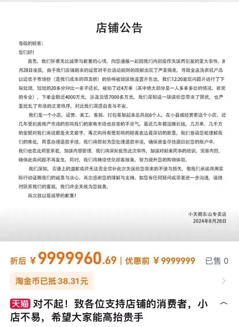据“小天鹅东山专卖店”公告,8月28日凌晨,由于店铺新开的运营人员对平台活动规则的理解出现了严重偏差,导致全店洗衣机产品以远低于市场价(是成本的四五折)的价格被错误地设置并售出。