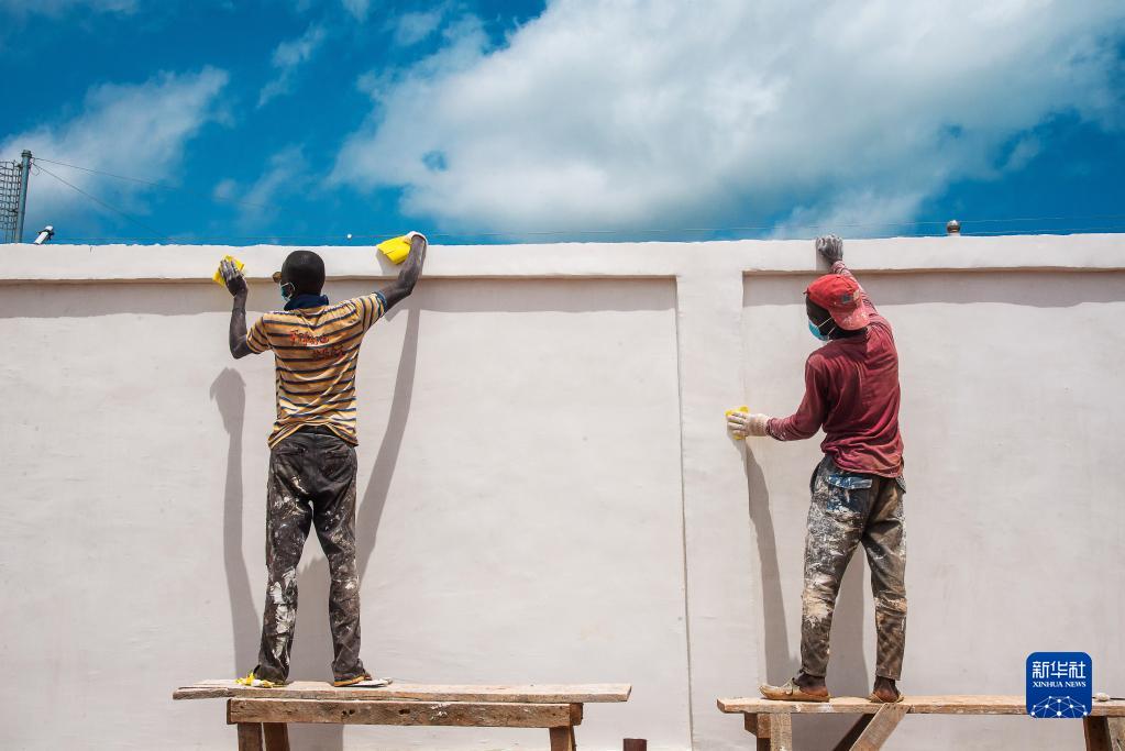 6月2日,在中非共和国首都班吉附近的宾博市,萨卡伊光伏电站的当地员工在粉刷墙壁。新华社记者罗毓摄