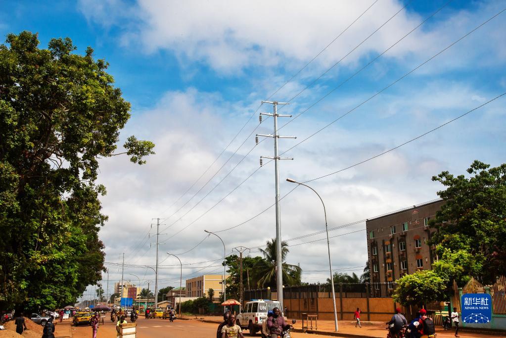 这是6月2日在中非共和国首都班吉附近的宾博市拍摄的援中非光伏电站项目的输电线路和杆塔。新华社记者罗毓摄
