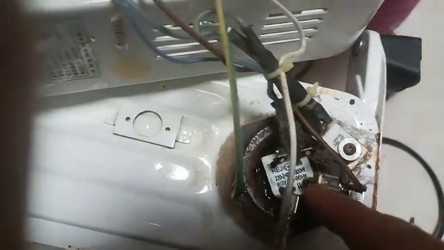 火线怎么来的?火线经过这里,钻砖头,其实接起来也可以,瓷片子起个固定作用。经过了火线,经过了以后,先经过温控开关,温控开关过来就到档位开关了,看到没有?然后红线,两个档位,两个线,一个是棕色线一个是白色线,白色线、棕色线不管怎么接,最终来到发热体上面,发热体一档、二档,一个棕色一个白色。