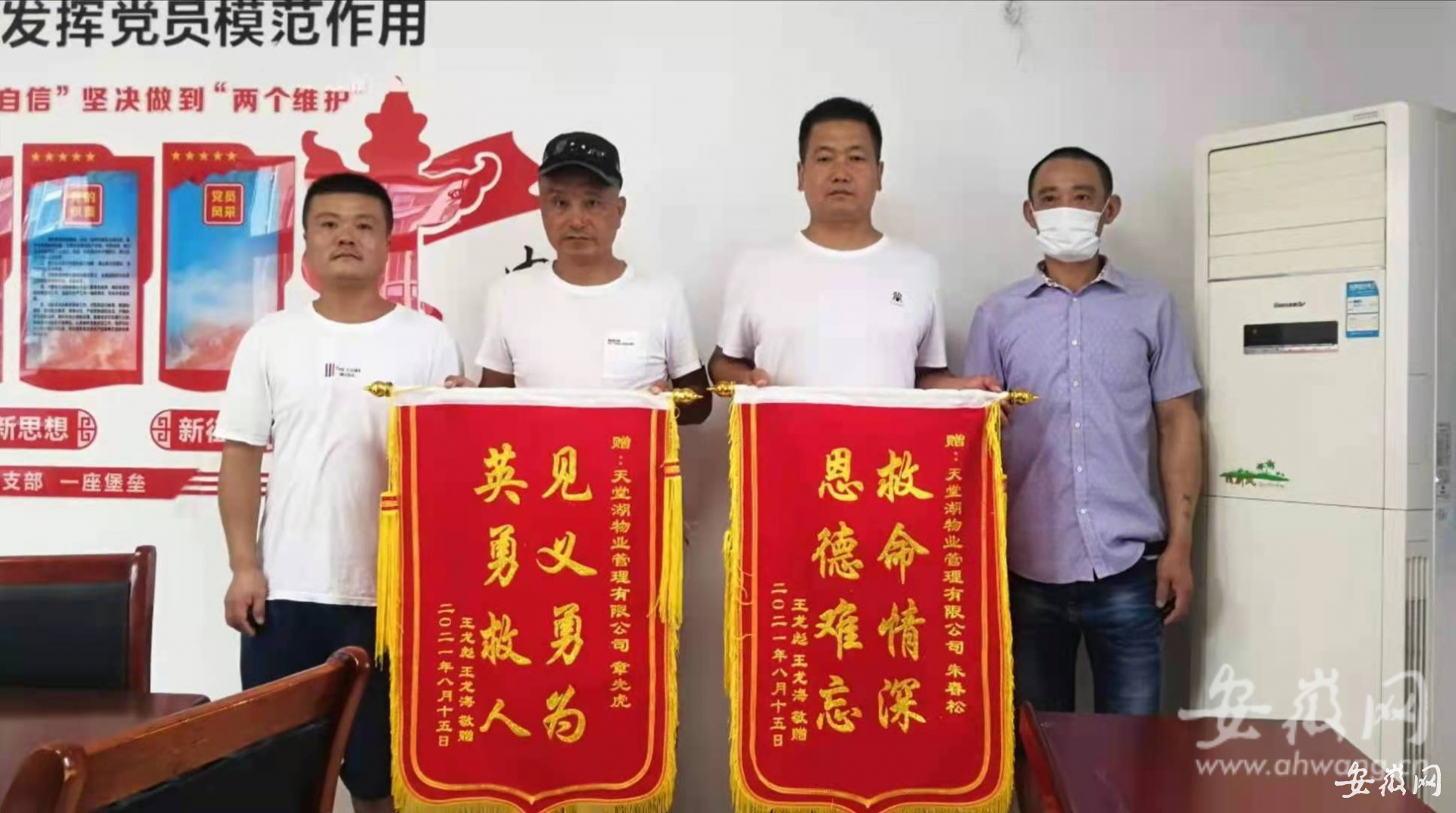 新安晚报 安徽网 大皖新闻讯 “太感谢你们了,朱大哥和章大哥的善举让我们感受到莫大的温暖。”近日,家住池州翠屏苑小区的王龙海、王龙彪两兄弟,捧着印有“见义勇为 英勇救人”“救命情深 恩德难忘”的两面锦旗,送到池州天堂湖物业管理有限公司,感谢朱春松、章先虎对其母亲的救命之恩。至此,朱春松、章先虎英勇救人的事迹才被大家所知晓。