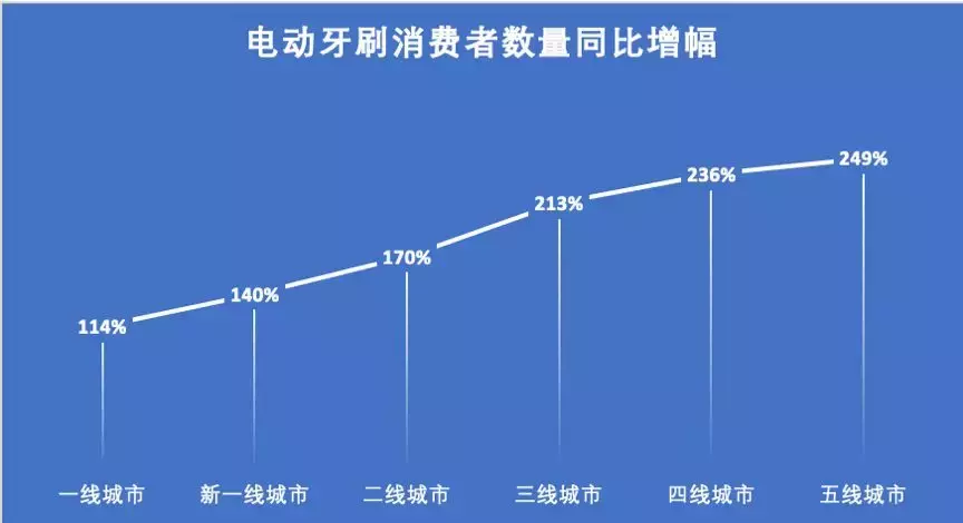 天猫数据显示,2019年前四个月里,电动牙刷的消费人数同比增长了175%,其中来自三四线及以下城市的消费者人数更是暴增了228%。