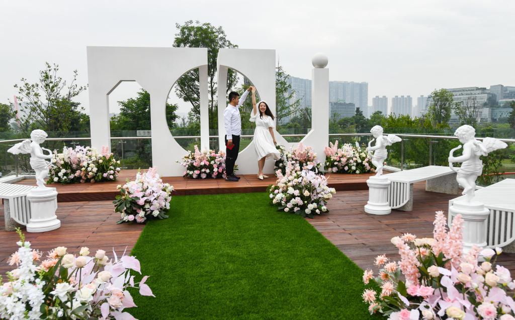5月20日,在成都高新区桂溪生态公园婚姻登记处,一对新人在合影留念。新华社记者王曦摄
