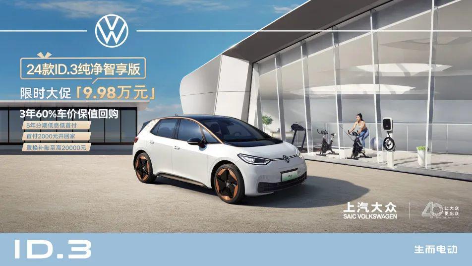 优惠政策:24款ID.3纯净智享版,限时大促方案:9.98万元,5年分期低息低首付,首付2000元开回家,置换补贴至高20000元。超保值3年60%车价保值焕新。