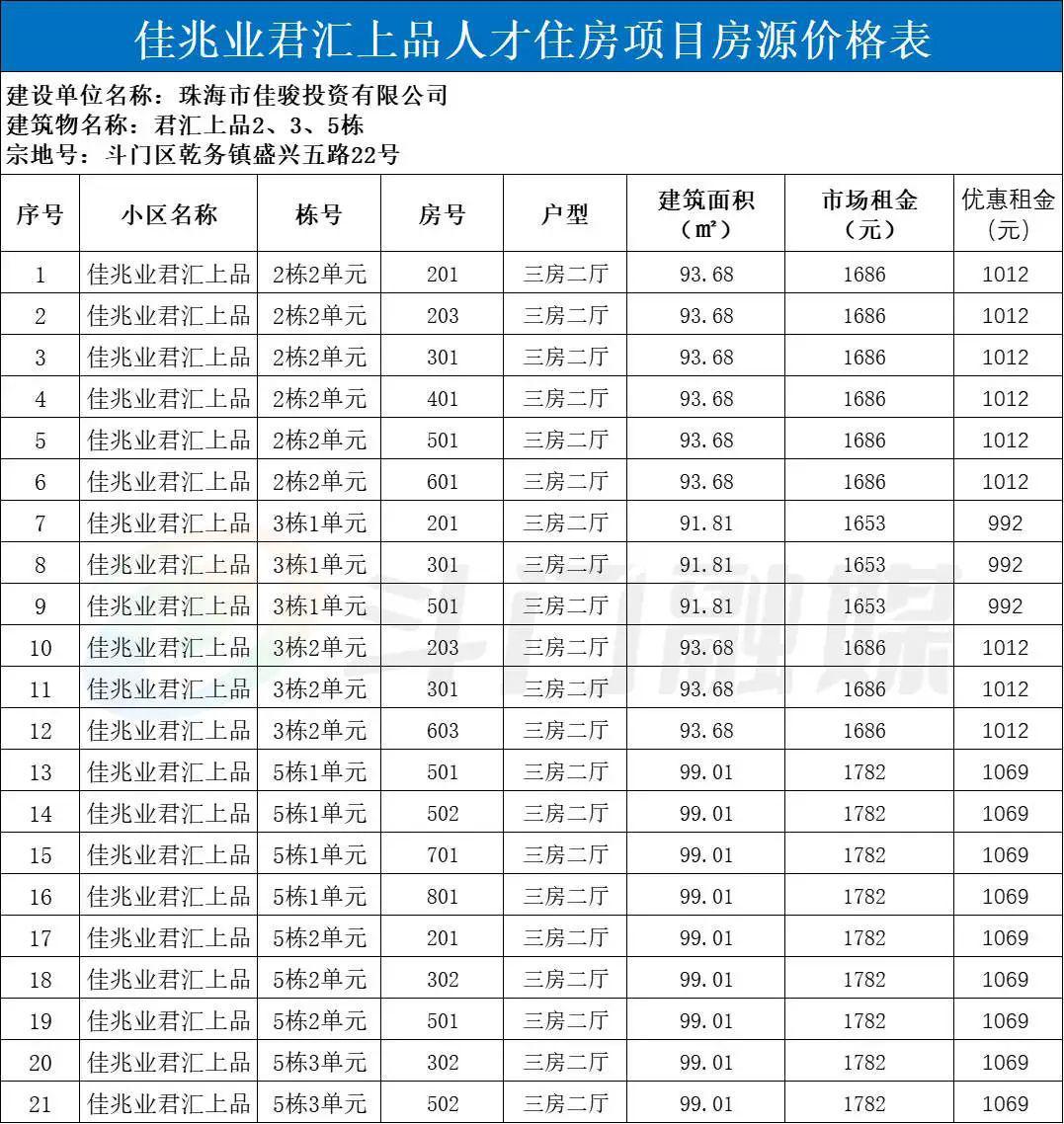 佳兆业君汇上品,位于斗门区乾务镇盛兴五路22号,毗邻乾务镇商业街。本次配租人才住房21套,为91-99平方米的三房二厅户型 ,含家具家电。