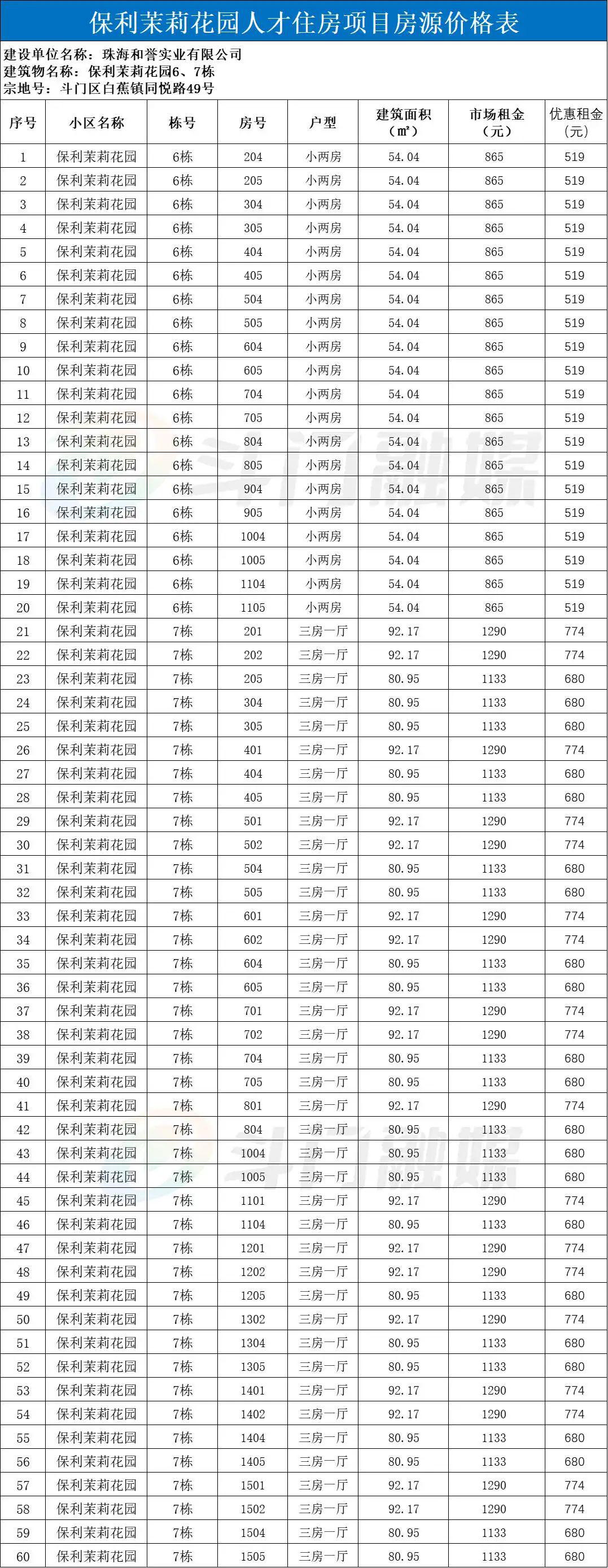 保利茉莉花园,位于斗门区白蕉镇同悦路49号,毗邻东堤路。本次配租人才住房60套,有52平方米、80平方米、92平方米的小两房、三房一厅三种户型 ,含家具家电。