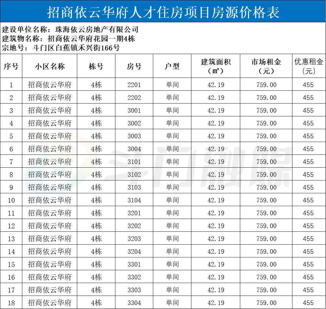 招商依云华府,位于斗门区白蕉镇禾兴街166号,毗邻招商花园城。本次配租人才住房18套,均为42平方米单间 ,含家具家电。