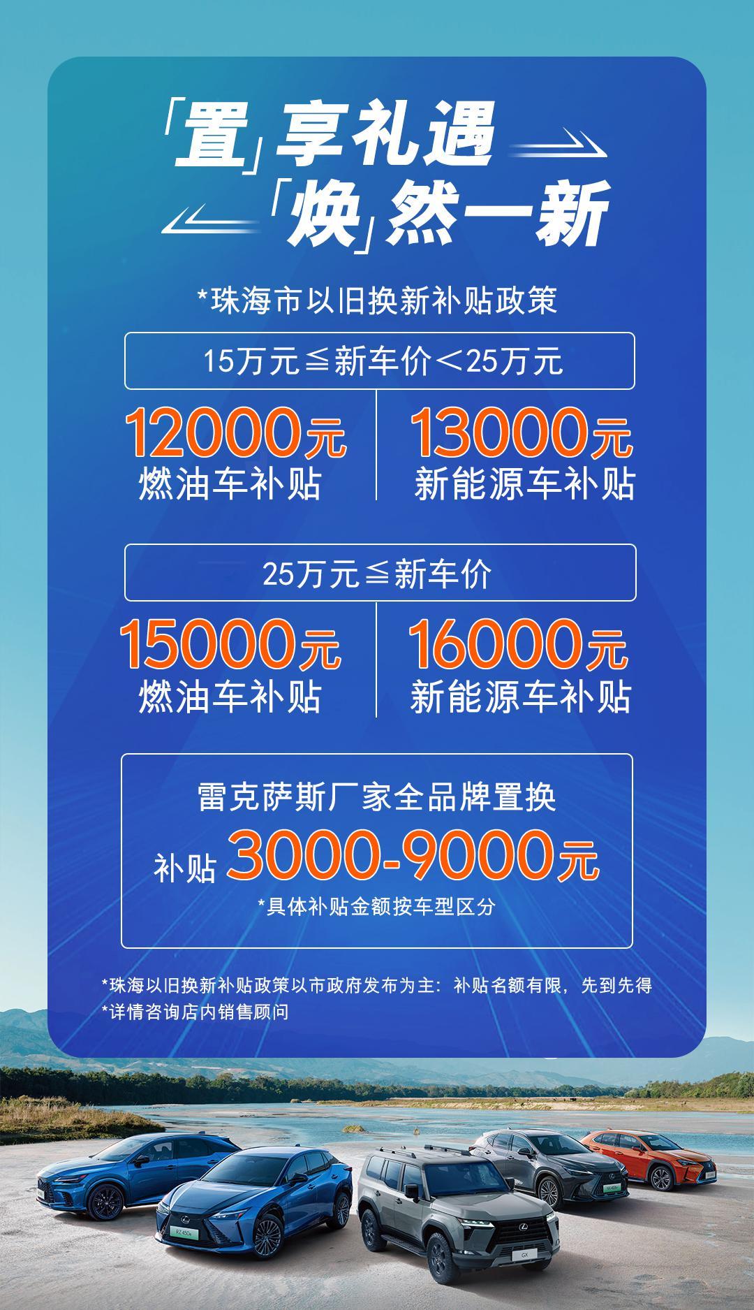 除“以旧换新”政策外,在斗门美东雷克萨斯店,市民还可享受雷克萨斯厂家全品牌置换礼遇,额外补贴3000至9000元 ,名额有限,先到先得。
